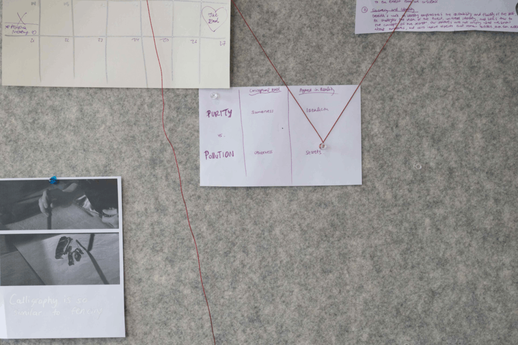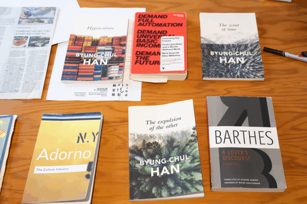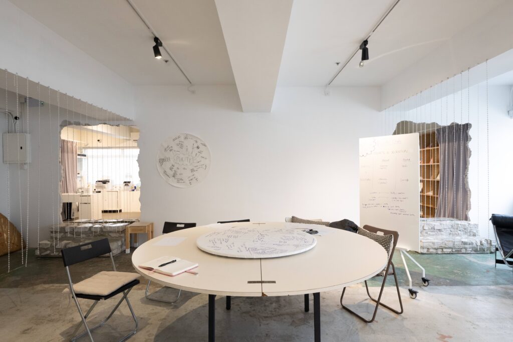 Lui’s temporary studio at Para Site resembled her interdisciplinary approach. A round table with a Lazy Susan, like those found in Chinese restaurants, anchored the space, with information on her former projects nearby. In the back, a seating area displayed books by Roland Barthes, Theodor W. Adorno, and Byung-chul Han, a nod to her background in philosophy. As part of the residency, Lui conducted a book club that invited participants to inscribe the central table with reflections on themes such as purity and secrecy, which will eventually inform an artist book examining intangible culture.