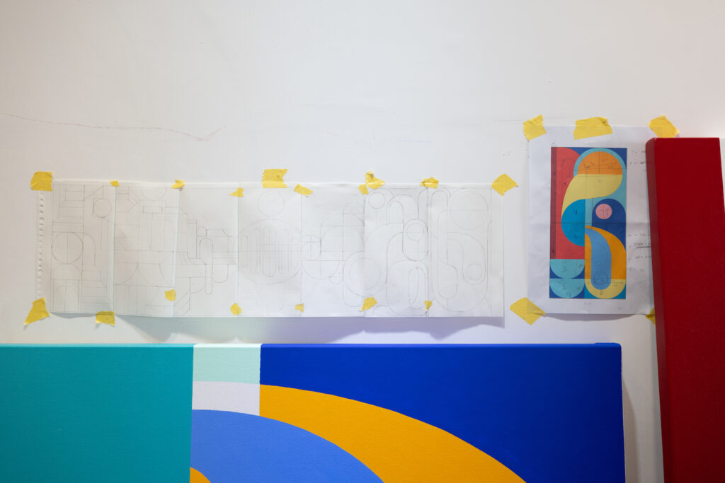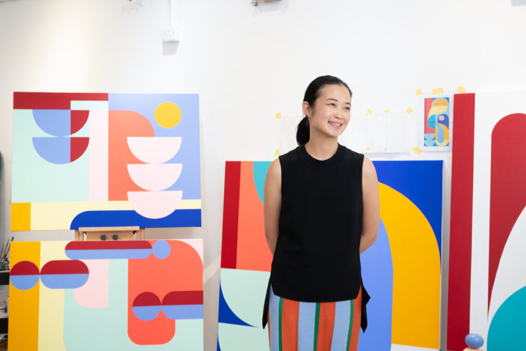 With its inviting glass façade, Mak’s studio offers passers-by a glimpse into her colourful world. Inside, vibrant paintings and sculptures abound. A graduate of Central Saint Martins, Mak began her career in fashion before transitioning to multimedia art. Her practice has since become instantly recognisable in Hong Kong, with works being featured by the Hong Kong Museum of Art, Hermès, and Lane Crawford. Characterised by geometric abstraction and vivid hues, poppy red, cyan, and powder pink, her art draws inspiration from Hong Kong’s cultural identity. She is currently working on a large-scale abstract interpretation of a shanshui (mountain and water) painting.