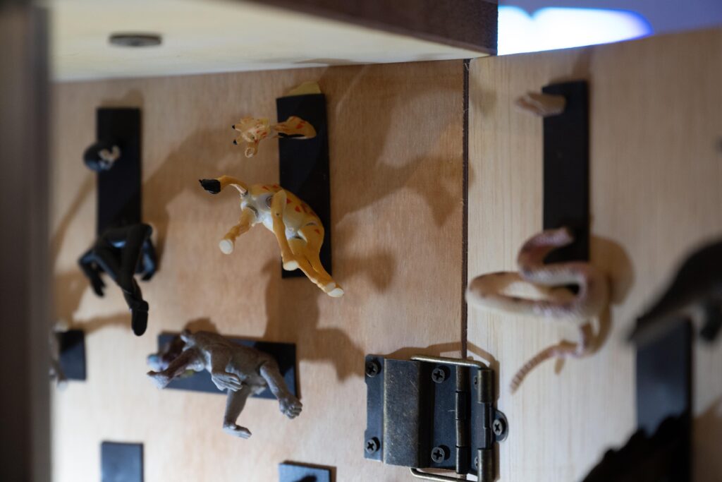 Floating Projects operates as a fully artist-run, multipurpose space, part exhibition venue, part library, and part café. The exhibition area often features a range of works from the collective, spanning video, installation and sculpture. Recently on view and especially eye-catching, Monster Boxes, a work by Kel Lok and Andio Lai, comprises a wooden box which stands no more than half a metre, featuring a small circular rotating platform in the middle, onto which two small figurines, both chimaeras composed of different animal figurines, are attached by magnets. Inside the box, more figurines await configuration.